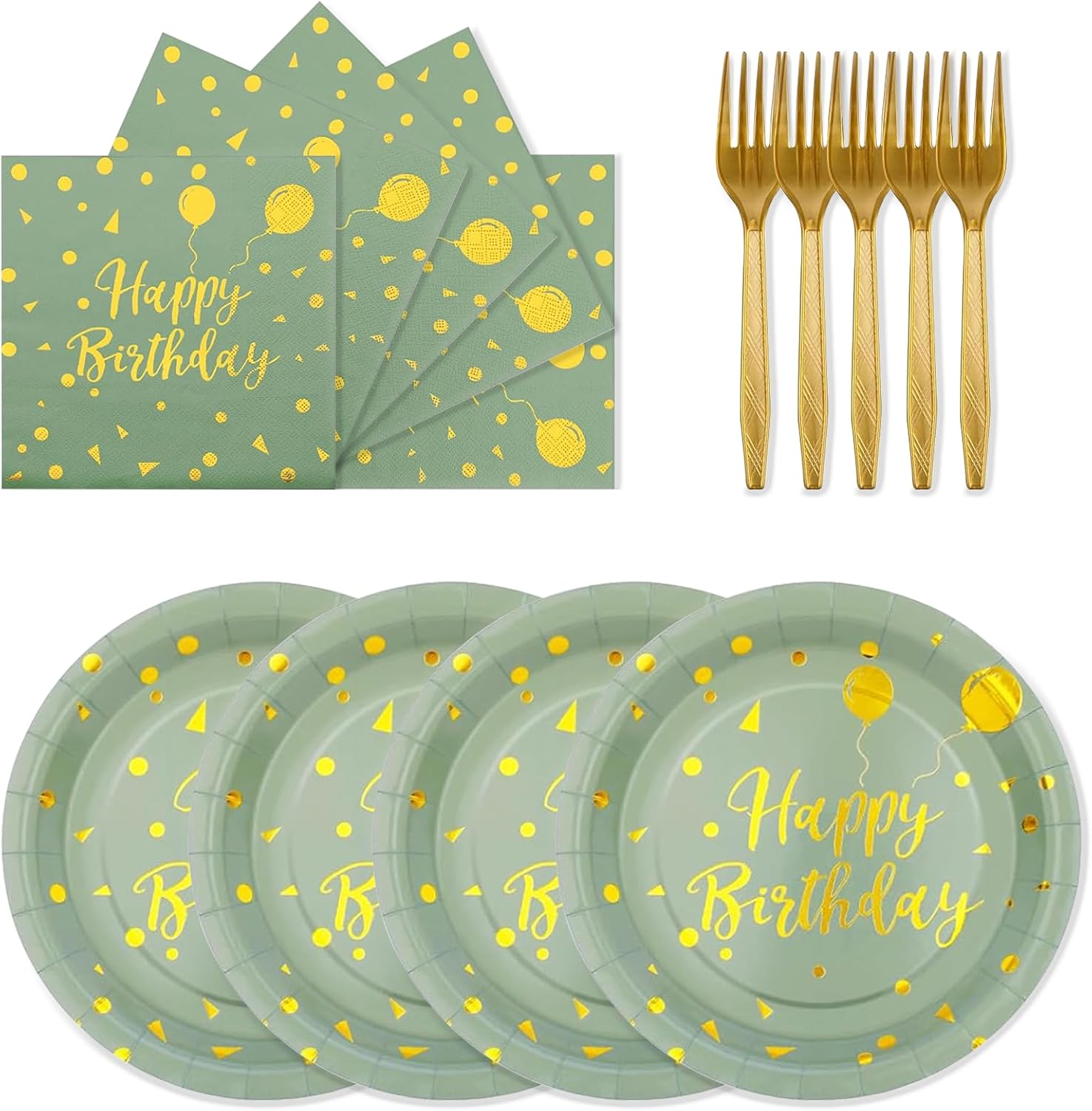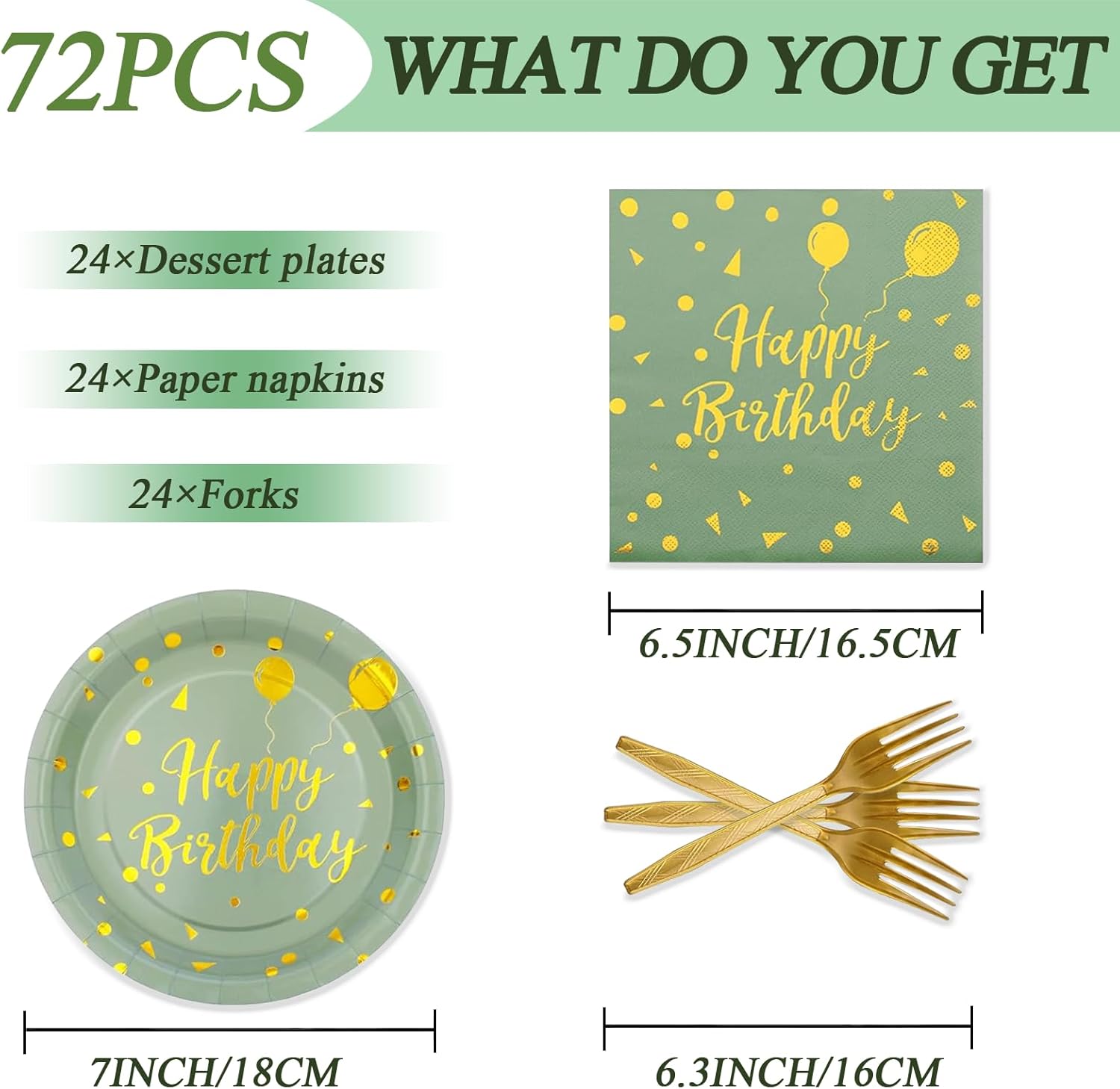 Introducing the 72PCS Happy Birthday Paper Plates Set in elegant Sage Green and Gold color scheme, the perfect tableware set to elevate your birthday celebration! This all-inclusive set includes 24 7-inch paper plates, 24 6.5-inch napkins, and 24 6.3-inch forks, making it ideal for serving up to 24 guests with convenience and style.