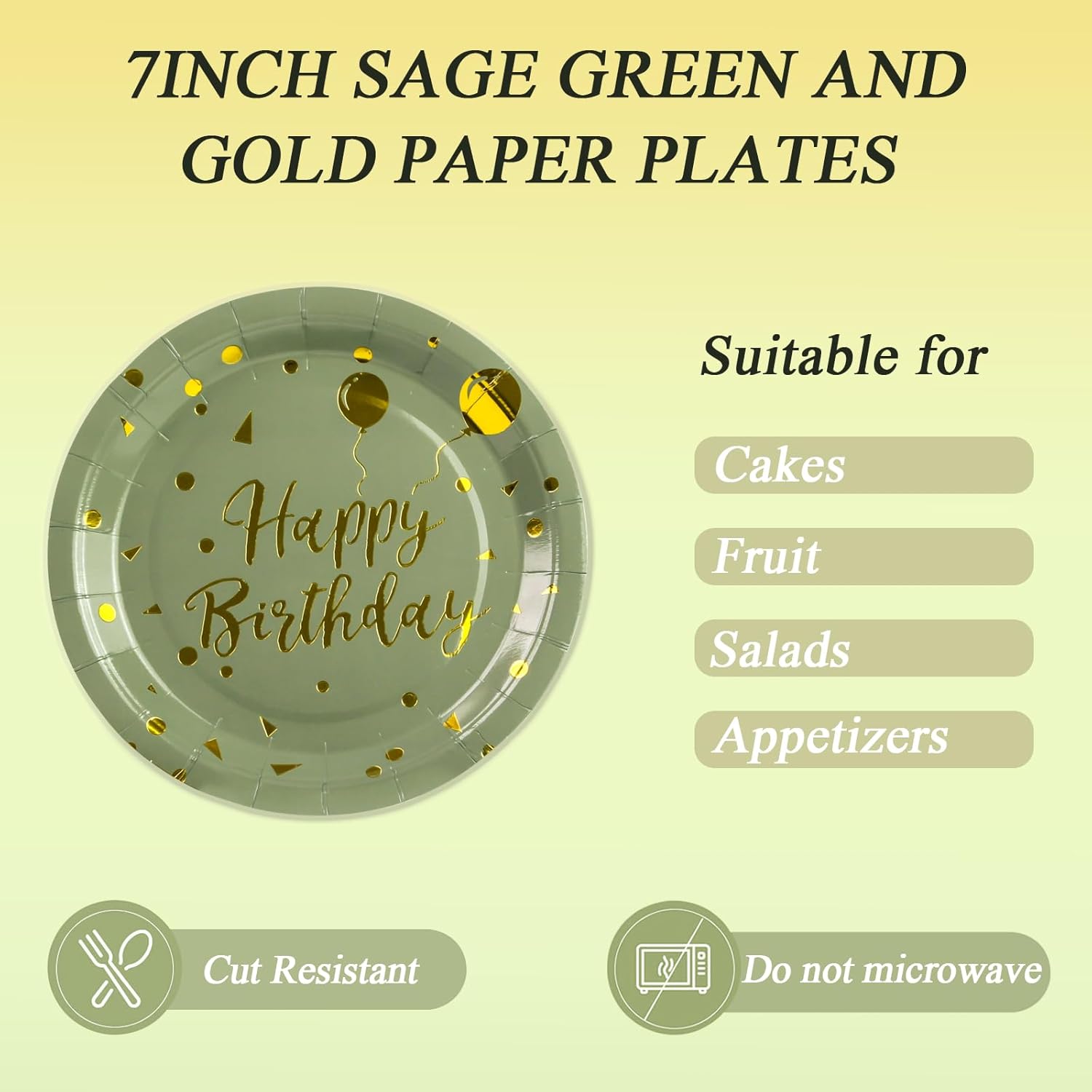 72PCS Happy Birthday Paper Plates – Sage Green and Gold Tableware Set Include 7Inch Paper Plates 6.5 Inch Napkins and 6.3 Inch Forks Disposable Decoration Supplies for Birthday Party,Serve 24