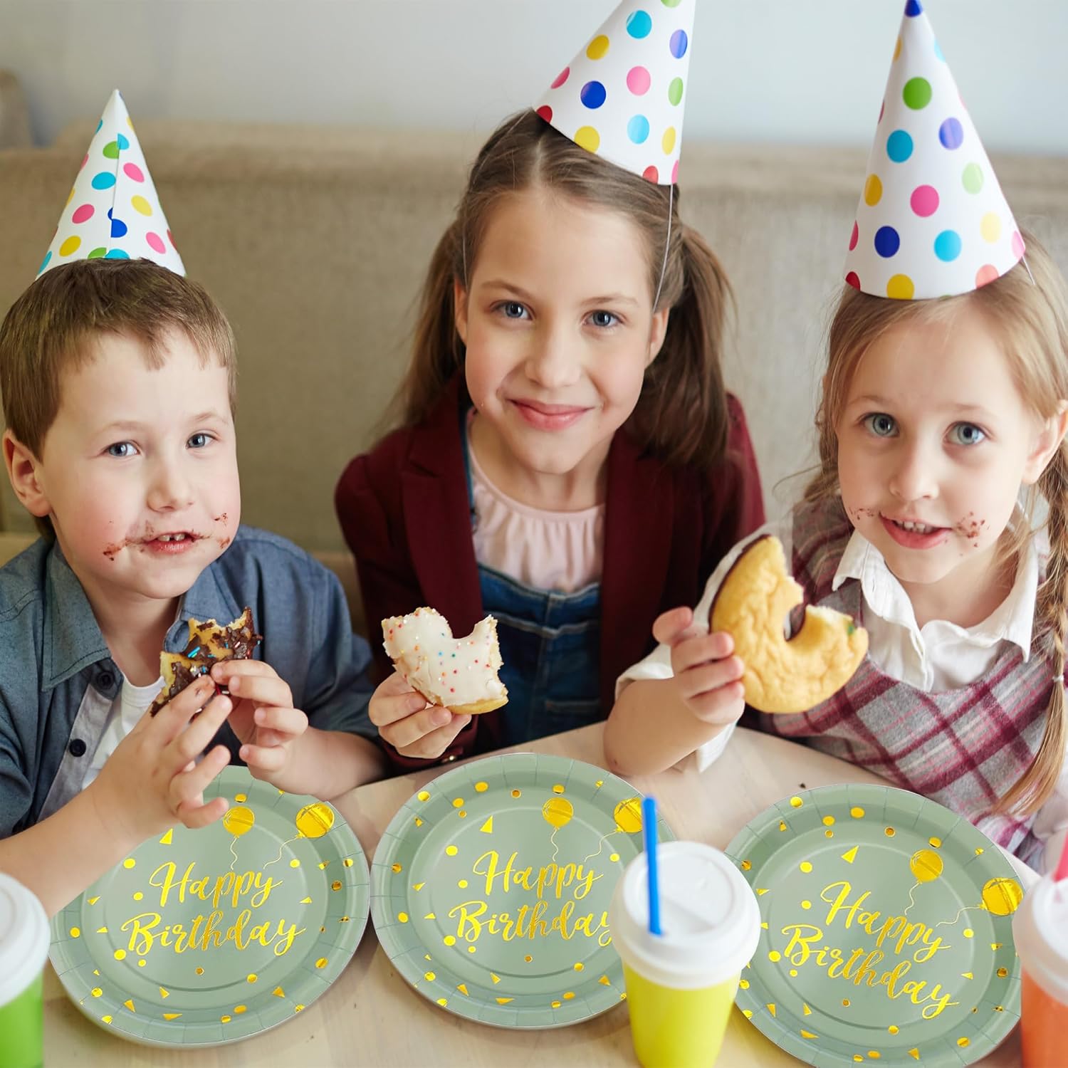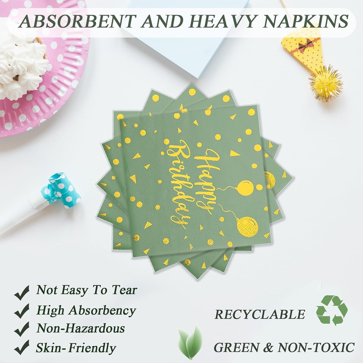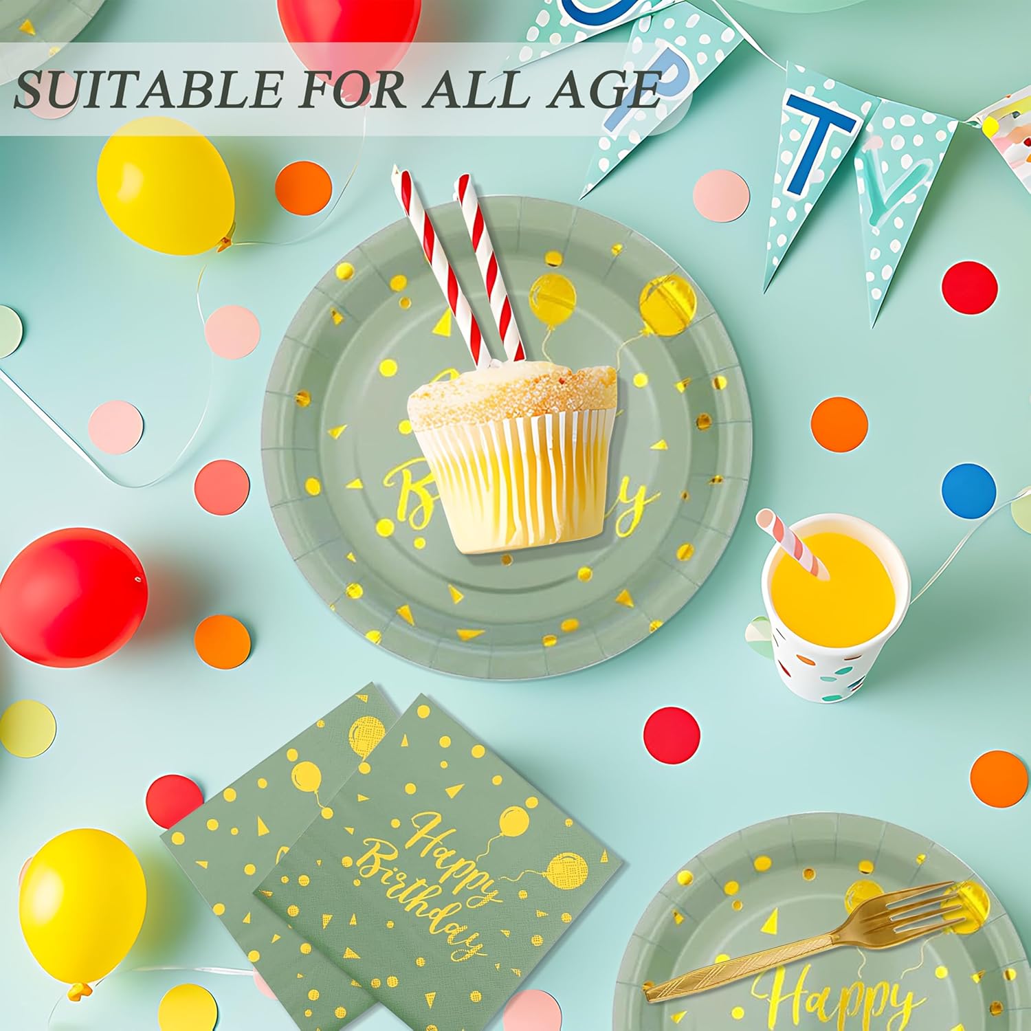 Crafted for easy cleanup and hassle-free hosting, these disposable paper plates, napkins, and forks are not only convenient but also add a touch of sophistication to your birthday party decor. The chic Sage Green and Gold color combination adds a trendy and festive flair to any celebration, creating a memorable and Instagram-worthy setting for your special day.